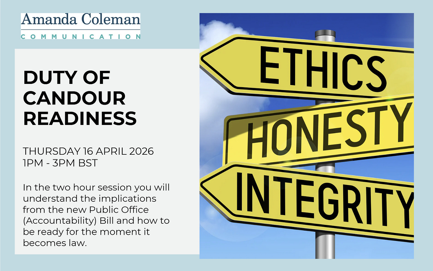 The Ethics session that takes place in April is now full but Amanda is planning to do another free session later in the year. There are still spaces available for the Duty of Candour Readiness session on 16 April at 1pm - 2pm BST. This will consider the actions that can be taken to help your organisation be ready for when it becomes law. It will help UK public sector organisations and others who want to ensure they are putting ethics at the heart of what they do. Email office@amandacolemancomms.co.uk for more information.