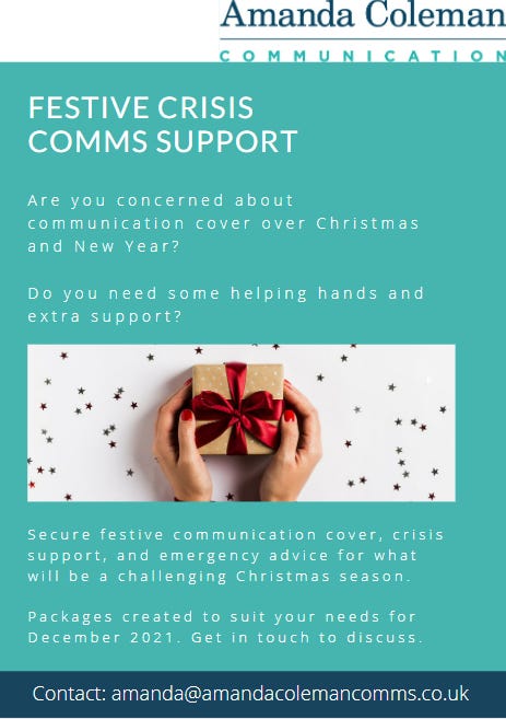 It is that time of year when we start to look at the festive period. As well as the opportunity for some much needed relaxation there is still a requirement to ensure issues, problems and crises can be dealt with. If you are considering how to cover the festive period, or what help is available then get in touch to discuss how I may be able to help. Email me at amanda@amandacolemancomms.co.uk